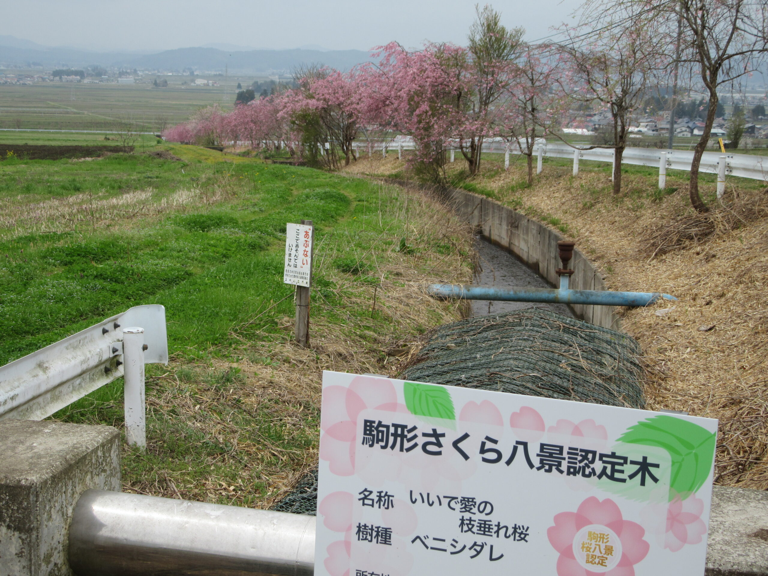 ○桜八景の一つ「いいで愛の桜並木」と案内板